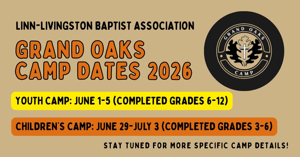 « All Events Linn Livingston/Thousand Hills Youth June 1 @ 2:00 pm - June 5 @ 10:30 am « St. Joseph Youth Camp Missouri Valley Youth Camp » 2026 LLBA-THBN Youth Camp Flyer Add to calendar Google Calendar iCalendar Outlook 365 Outlook Live Details Start: June 1 @ 2:00 pm End: June 5 @ 10:30 am Event Category: Camps Venue Grand Oaks Baptist Assembly, Inc. 9463 State Highway 190 Chillicothe, MO 64601 United States Phone 660-646-1906 View Venue Website